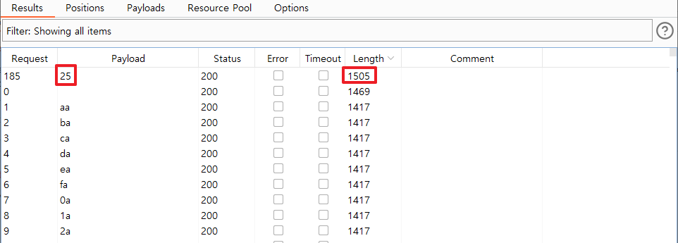 유효한 값은 응답값이 다르기 때문에 Length가 다른것을 확인